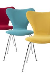 Cadeira Formiga é conformada em concha única de compensado multilaminado com espumas de densidade 30 Kg/m3. Pode ser montada em base 4 pés cromada, bem como base giratória cromada e pistão a gás. Revestimento a escolha do cliente.