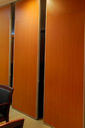 A divisória se desloca pelo trilho através de sistema de roldana em Nylon com um ou dois pontos de fixação por painel, de acordo com projeto e conforme disponibilidade do ambiente para empilhamento.