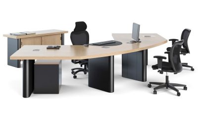 Com kits de tomadas nos tampos e recorte semielíptico revestido em couro natural (opcional). Mesas de reuniões, armários e gaveteiros complementam a linha.