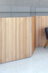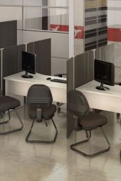 Para complementar as estações de trabalho, a linha oferece mesas consoles fixadas através de mãos francesas em biombos Physio.