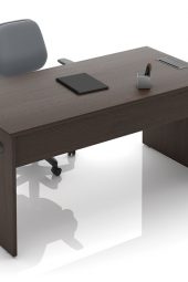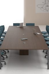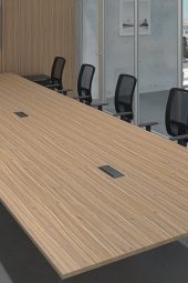 Com diversos formatos de tampos, a linha contempla mesas individuais, angulares e diálogo com os pés painel.