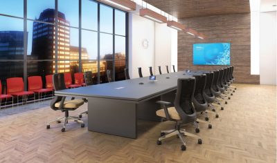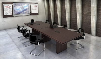 A Mesa de Reunião Linha Diret, possui tampos retangulares com 56mm de espessura, estrutura em madeira e eletrocalhas que permitem acesso aos usuários através de sistema articulado sobre o tampo. O modelo Direct é ideal para sala de reunião e ambientes executivo