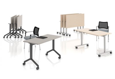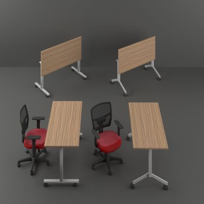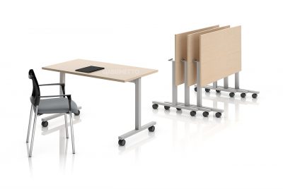 A mesa Slim com tampo dobrável, foi desenvolvida para ambientes de escritórios que necessitam de adequações conforme as diversas atividades, é usada para reuniões, dinâmicas de grupo, palestras, salas de aula, treinamento entre outros.