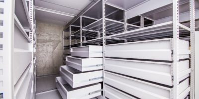 Arquivo Deslizante com acionamento mecânico, possui uma estrutura sofisticada com fechamentos frontais, traseiros, laterais, entre faces e trações dos módulos. Possui uma grande variedade de acabamentos externos que podem ser personalizados conforme o ambiente.